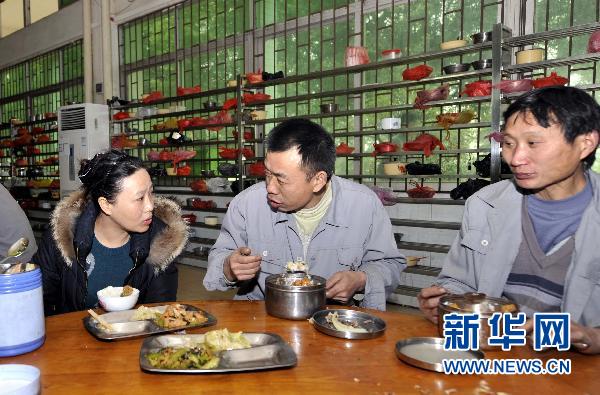 農民工全國人大代表胡小燕——為全國兩會做好準備胡小燕(中)在公司生產車間食堂和工友們交流(2月16日攝)。在廣東佛山打工十幾年,胡小燕獲得過公司所在地白坭鎮(zhèn)“十佳外來工”、三水區(qū)“十佳外來工”、佛山市“十佳外來工”稱號,2008年1月21日,經過廣東省十一屆人大一次會議第三次全體會議無記名投票,她成為中國第一位農民工全國人大代表。胡小燕現在在佛山市三水新明珠建陶工業(yè)有限公司工作。在完成日常工作的同時,她認真地履行職責。去年兩會,她提交了5項涉及農民工權益的建議,諸如醫(yī)保轉移、子女教育、技能培訓、工傷賠付等。一年來,她所關注的還是農民工子女入學、空巢老人等與農民工息息相關的議題。全國兩會在即,胡小燕也在積極為兩會做著最后的準備。新華社記者 陳曄華攝