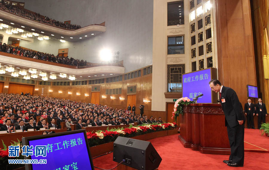 3月5日,第十一屆全國人民代表大會第四次會議在北京人民大會堂開幕。這是國務(wù)院總理溫家寶作政府工作報告前向全體代表鞠躬。新華社記者蘭紅光攝
