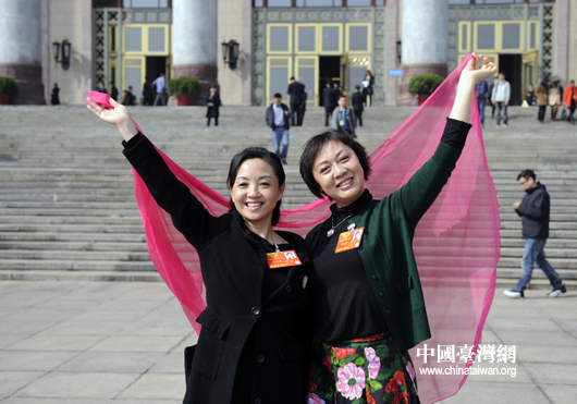在天安門廣場上,女委員成為媒體記者追捧的焦點。(中國臺灣網 發)