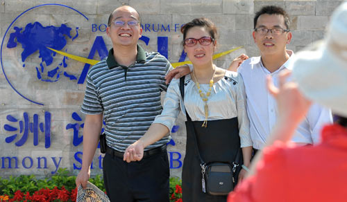 4月9日,游客在博鰲亞洲論壇永久會址前合影留念。