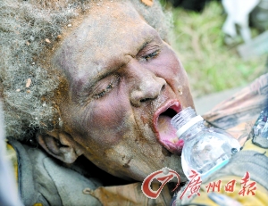 這名約69歲的婦女叫埃娜·齊齊,被救出后滿臉灰土,饑渴飲水。