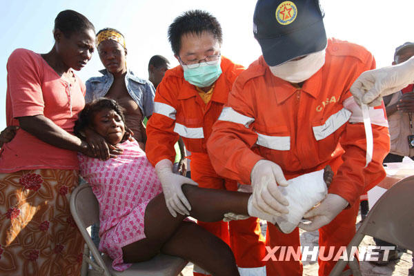 1月18日,中國國際救援隊醫(yī)生在海地首都太子港總統(tǒng)府廣場前為一名受傷的女孩包扎傷口。新華社記者袁滿攝