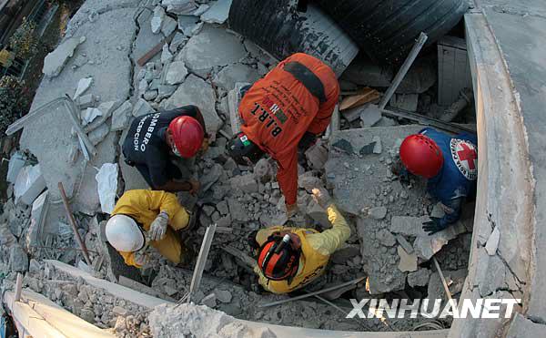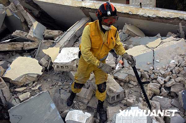 1月20日,在海地首都太子港,救援人員在一所大學醫學院的廢墟中搜尋幸存者。目前,對地震幸存者的搜尋工作仍在繼續。新華社發(烏巴爾多·岡薩雷斯攝)