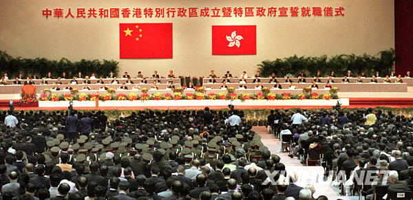 1997年7月1日0時(shí)0分0秒,中國政府恢復(fù)對香港行使主權(quán)。這是當(dāng)日凌晨,中華人民共和國香港特別行政區(qū)成立暨特區(qū)政府宣誓就職儀式在香港會(huì)議展覽中心新翼七樓隆重舉行。新華社發(fā)