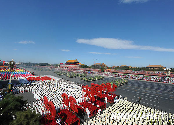 10月1日,首都各界慶祝中華人民共和國(guó)成立60周年大會(huì)在北京舉行。這是受閱部隊(duì)通過(guò)天安門廣場(chǎng)。新華社記者 丁林?jǐn)z