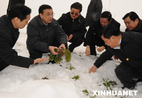 這場(chǎng)罕見的雨雪使農(nóng)作物受損嚴(yán)重。在達(dá)州宣漢縣、巴中通江縣、廣安鄰水縣等地,李克強(qiáng)冒雪深入農(nóng)田、菜地,心情沉重地察看農(nóng)作物和蔬菜受災(zāi)情況。他到貧困戶家中摸糧缸看水缸,并和當(dāng)?shù)馗刹楷F(xiàn)場(chǎng)商討恢復(fù)生產(chǎn)問題,強(qiáng)調(diào)要及早謀劃,做好生產(chǎn)自救的各項(xiàng)準(zhǔn)備,并適時(shí)進(jìn)行結(jié)構(gòu)調(diào)整。