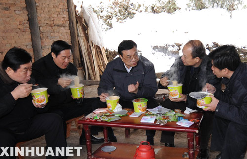 這是1月31日,李克強(qiáng)乘坐裝有防滑鏈的汽車在崎嶇覆冰的山路上行進(jìn)3個(gè)小時(shí),來(lái)到川北山區(qū)宣漢縣老君鄉(xiāng)紫云村。在察看災(zāi)情、慰問群眾后,就和隨行陪同的領(lǐng)導(dǎo)一起邊用餐邊研究救災(zāi)工作。飯后,又繼續(xù)驅(qū)車到下一個(gè)村子慰問。 新華社記者 李學(xué)仁 攝