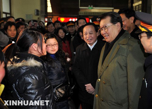 這是1月30日,李長春在湖北武漢漢口火車站看望慰問旅客。