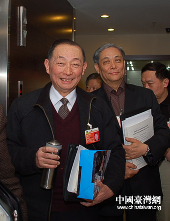著名京劇表演藝術(shù)家梅葆玖(左)抱著一摞資料剛從小組討論會(huì)場出來。
