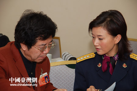 著名鋼琴演奏家滕矢初與歌唱家宋祖英在小組會議上討論。
