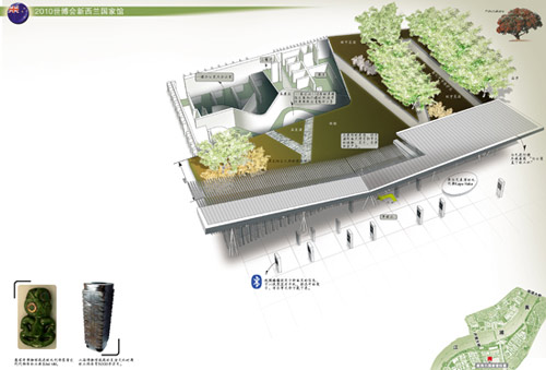 新西蘭館占地面積2000平方米,與中國國家館僅一步之遙。展館的正前方是一個白色遮陽棚,觀眾這里等候時,會有毛利表演團隊載歌載舞,遮陽棚后面是棕褐色的斜坡形展館,頂上覆蓋著一個茂盛的花園。