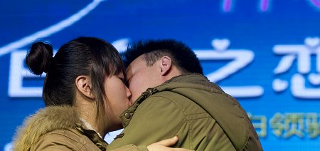 昨日,上海靜安體育館,一對男女在“白色情人節(jié)”相親會上當(dāng)眾表白后擁吻。早報記者 魯海濤 圖