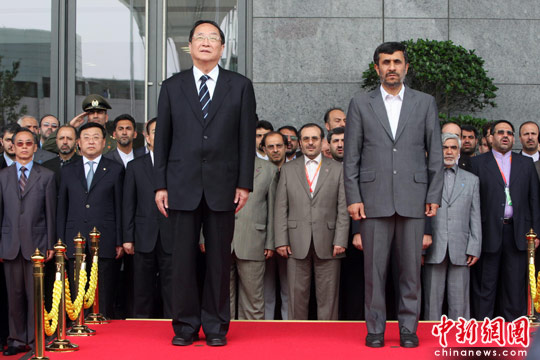 6月11日,伊朗總統艾哈邁迪·內賈德在上海世博園出席伊朗國家館日活動。圖為內賈德與中共上海市委書記俞正聲(左)出席伊朗國家館日升旗儀式。中新社發 湯彥俊 攝