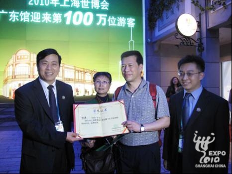 6月9日上午10點,2010年上海世博會廣東館迎來了開館以來的第100萬名參觀者——來自湖北省十堰市的嚴先生。廣東省貿(mào)促會副會長、廣東館副館長司慶偉向這名幸運游客頒發(fā)榮譽證書,并贈送了一輛自行車以鼓勵他綠色出行。
