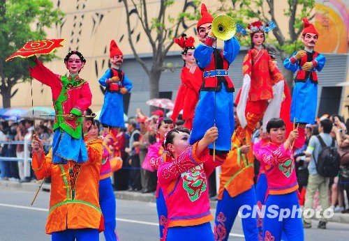 5月19日,上海世博會山西活動周開幕。其中,盛裝巡游集中展示了太原鑼鼓、孝義木偶“娶親”、吉縣“壺口嗩吶風情”、翼城花鼓、清徐背棍等山西民俗藝術。中新社發(fā) 沈春琛 攝