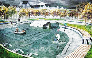 水廣場由幾個形狀、大小和高度各不相同的水池組成,水池間有渠相連。平時是市民娛樂休閑的廣場;暴雨來臨,就變成一個防澇系統。由于雨水流向地勢更低洼的水廣場,街道上就不會有積水。所有水池布成一張循環網絡,雨量大時,從大水池中分流到溝渠,雨量小時,水又回流入大水池。雨水不僅可在水池間循環流動,還能被抽取儲存為淡水資源。