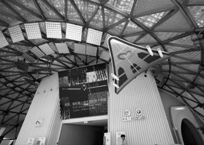 在中國航空館的等候大廳,擺放著各種未來客機模型。據介紹,飛翼客機與現有客機最大的不同是沒有機身和機翼的明顯區分,而是將寬大的機體和后掠的機翼完美融合在一起。與常規設計相比,這樣的設計使整個飛機機體都能產生升力,同時還能降低阻力,因此有望減少30%以上的燃料消耗。此外,飛翼客機獨特的外形使它在傾斜轉彎時更為平穩,乘客不易產生暈機反應。除了這個模型外,飛翼外形的概念客機在航空館中還多次出現。