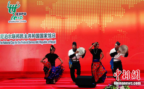 9月3日,上海世博園迎來尼泊爾聯邦民主共和國國家館日。當日在世博中心舉行的官方儀式上,身著尼泊爾特色服飾的藝術家表演當地著名的山地舞蹈。中新社記者 郭虹 攝