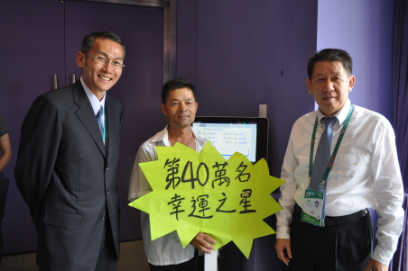 林先生在刷了RFID微笑卡之后,確認為臺北館第40萬名參觀者,又能夠合家一起與臺北市的知名景點合影,直說“好幸運”!林金火先生在家人的陪同下參觀臺北館,他對于互動區內能夠透過觸摸的方式,展現河水變清澈、魚兒水中游表示很特別,也體驗與臺北美景的合影,林金火對臺北印象良好,一家人當場決定,“這輩子一定要去一趟臺北玩!”
