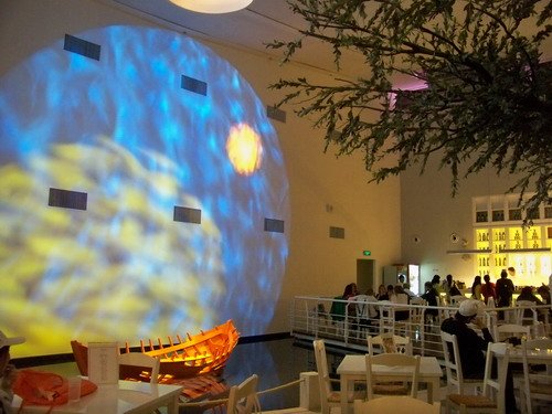 希臘館內的橄欖樹、浮在水面的小船、墻上的太陽