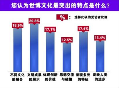 本次調(diào)查中,20.8%的受訪者認(rèn)為,上海世博會(huì)的文化特點(diǎn)是人類文明成果的集中展示;其次是不同區(qū)域、種族文化的融合;而呈現(xiàn)在參觀者面前的,確確實(shí)實(shí)是文化的多元化特征。