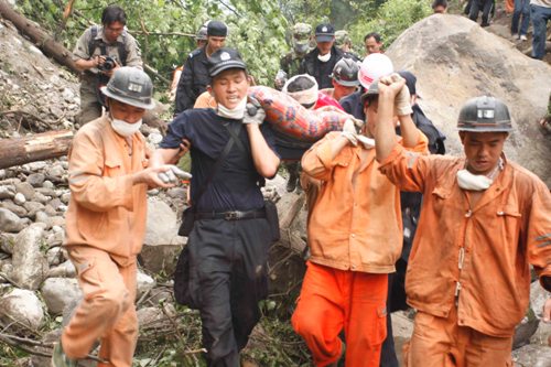 17日早上9點多,位于四川德陽什邡市紅白鎮的深圳特警救援隊接到任務:在離紅白鎮幾十里外的山溝里有一個倉庫,倉庫內有重要的國家物資需要轉移。特警隊8名隊員和解放軍某部的3名戰士立即組成武裝分隊,向倉庫方向發進。通往倉庫的路全毀了,他們只能徒步翻越幾座山才能到達。