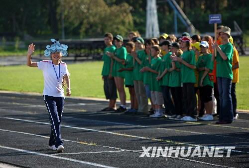 8月3日,在俄羅斯南部黑海之濱圖阿普謝的“小鷹”全俄兒童中心,正在這里療養的四川地震災區學生與俄羅斯學生一起參加4×100米接力賽。當日,“小鷹”全俄兒童中心舉行運動會,中俄學生同場競技,一展風采。新華社記者沈伯韓攝