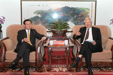 圖1:全國政協副主席、中國和平統一促進會副會長羅豪才(右)親切會見訪問團成員。