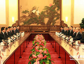 中共中央總書記胡錦濤26日下午在人民大會堂會見中國國民黨主席吳伯雄和他率領的國民黨大陸訪問團全體成員,并同吳伯雄舉行會談。胡錦濤回顧了兩岸關系一年來取得的一系列重要進展,并就在新的起點上進一步推動兩岸關系向前發展發表重要意見。