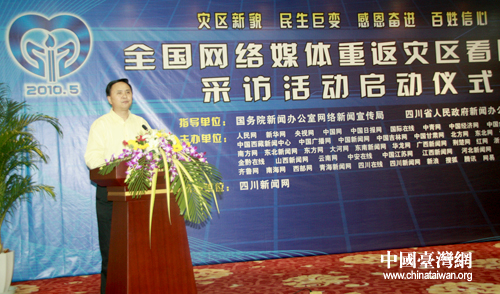 中國(guó)臺(tái)灣網(wǎng)5月8日成都消息 為銘記、見證并記錄地震災(zāi)后恢復(fù)重建的歷史,充分展現(xiàn)全國(guó)人民的無疆大愛、對(duì)口援建和災(zāi)后重建取得的顯著成效,由國(guó)務(wù)院新聞辦公室網(wǎng)絡(luò)局、四川省人民政府新聞辦公室主辦的“新生活·新希望·新發(fā)展”——全國(guó)網(wǎng)絡(luò)媒體紀(jì)念“5.12”汶川特大地震兩周年全國(guó)網(wǎng)絡(luò)媒體重返災(zāi)區(qū)看民生采訪活動(dòng),今日在成都正式啟動(dòng)。