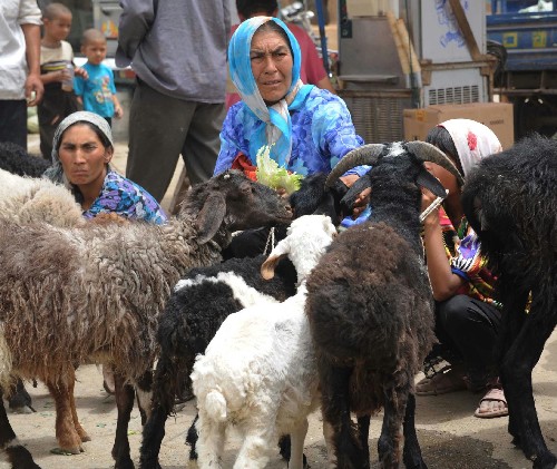 7月25日,幾名農村婦女在喀什國際大巴扎上銷售自家喂養的羊。在南疆的喀什、阿克陶、莎車和葉城等地,一到維吾爾族群眾的巴扎(趕集)日,人們紛紛來到設在城市周邊的巴扎上交易,形成了喀什國際大巴扎、葉城新世紀農貿市場、阿克陶縣中心農貿市場等一批每天人流量達5萬以上的超級大巴扎。新華社記者 周文杰 攝