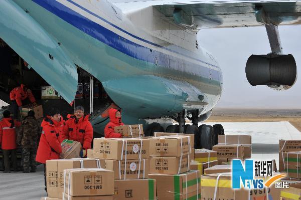 4月15日,救援隊員在青海玉樹巴塘機場卸載救災物資。 新華社發