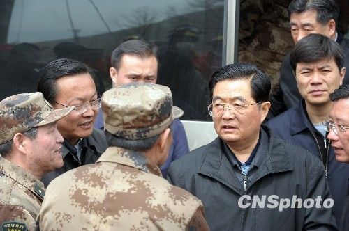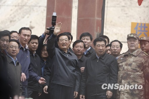 4月18日,中共中央總書記、國(guó)家主席、中央軍委主席胡錦濤飛抵玉樹(shù),看望慰問(wèn)地震災(zāi)區(qū)干部群眾,實(shí)地指導(dǎo)抗震救災(zāi)工作。 中新社發(fā) 盛佳鵬 攝