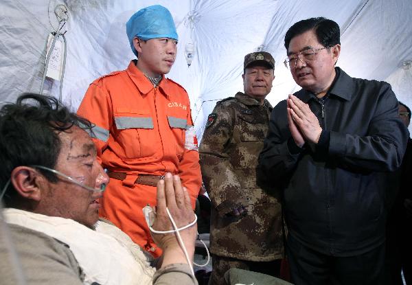 胡錦濤在玉樹查看災情 親切看望傷病員(組圖)
