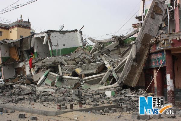 4月14日拍攝的玉樹州結古鎮倒塌的房屋。當日早上7時49分,青海省玉樹藏族自治州玉樹縣(北緯33.1度,東經96.7度)發生7.1級地震。截至14日13時,青海玉樹地震已造成300人遇難,8000人受傷。新華社發(吳宏 攝)