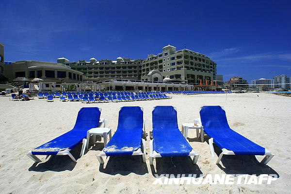 5月12日拍攝的照片顯示墨西哥旅游勝地坎昆海灘上見不到一個游客。甲型H1N1流感使墨西哥旅游業(yè)遭受重創(chuàng)。墨西哥地方官員11日說,游客銳減已迫使旅游勝地坎昆等地的25家酒店關門。墨旅游促進委員會公布最新預測稱,2009年墨西哥旅游業(yè)盈利將比2008年減少近三成。新華社/法新