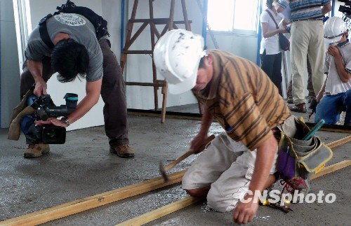 8月23日,大陸3名技術人員現身臺灣高雄縣災民安置活動板房建設工地。深圳雅致集成房屋公司工程部經理楊云接受訪問時表示,他們一行將為活動板房搭建工作提供技術支持,并對現場施工人員進行培訓;另外,公司有7個技術人員待命、可隨時前來協助。中新社發 劉舒凌 攝