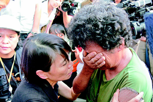 馬英九夫人周美青昨天到臺東縣嘉蘭村慰問災(zāi)民,失去家園的婦人見到她痛哭失聲,周美青半跪著緊擁婦人,輕聲安慰:“人在就好!我們還有希望。”圖片來源:臺灣《聯(lián)合報(bào)》