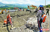 臺軍方挖掘行動昨天截止,但母親遭埋的高雄縣六龜新開居民卓靜鴻(右)不愿放棄,昨仍要求民間機具定點開挖。來源:臺灣《蘋果日報》