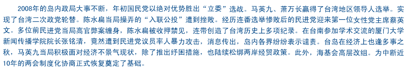 5月20日,馬英九、蕭萬長在臺北宣誓就任臺灣地區第12任正副領導人。馬英九在就職演說中表示,要在“九二共識”的基礎下,盡早恢復兩岸協商。馬英九上任后,遏止了臺灣急“獨”勢力,兩岸關系也出現積極發展勢頭。2005年“連胡會”五項愿景得以推動、逐步實現,李登輝“戒急用忍”、陳水扁當局“鎖國”時代正式走入歷史。【全文】