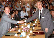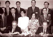 "海峽交流基金會"("海基會")于1990年11月21日成立,1991年3月9日舉行開幕式,正式掛牌運行。該會分設由43人組成的董事會和由6人組成的監事會;"總統府資政"孫運璇為名譽董事長;國民黨中常委、臺灣工商協進會會長辜振甫任董事長;國民黨中常委、臺灣工業總會理事長許勝發和臺灣紅十字會秘書長,"國防部"法律顧問陳長文為副董事長兼秘書長,該會內設秘書處,文化服務處、經貿服務處、旅行服務處及綜合服務處等6個業務單位,主要功能是接受"陸委會"委托,辦理兩岸交流所衍生的各項事務。 |