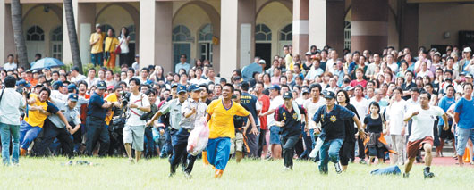 臺(tái)灣救援直升機(jī)昨天陸續(xù)載出高雄縣小林、六龜災(zāi)區(qū)村民,在旗山中學(xué)守候的家屬等不及直升機(jī)降落就往前沖,警察連忙緊追攔人。圖片來源:臺(tái)灣《聯(lián)合報(bào)》