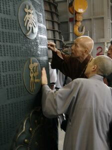 據了解,該法華鐘是法鼓山委托日本“老子制作所”制作的,現即將制成。該鐘仿唐鐘造型,渾厚樸實,線條優美,鑄有中文七萬余言,是日本“老子制作所”有史以來鑄字最多的一座巨型梵鐘。該鐘將于今年年底前運回臺灣,安置在法鼓山鐘山之麓。