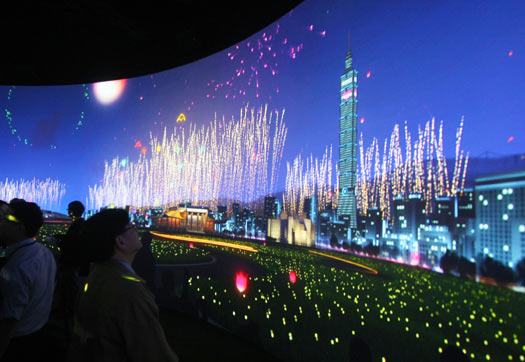 臺(tái)北花博夢想館3日舉行開幕儀式,受邀貴賓在環(huán)型劇場前觀看交互式影音動(dòng)畫。圖片來源:“中央社”