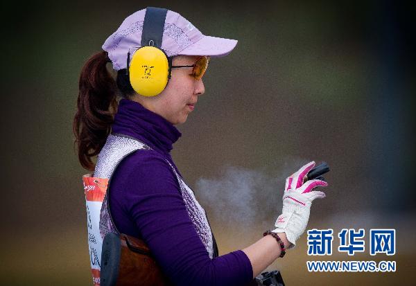 11月21日,中國選手李清念在比賽中。當日,在第16屆亞運會射擊女子雙多向飛碟決賽中,李清念以106分的總成績奪得冠軍。 新華社記者 呂小煒 攝