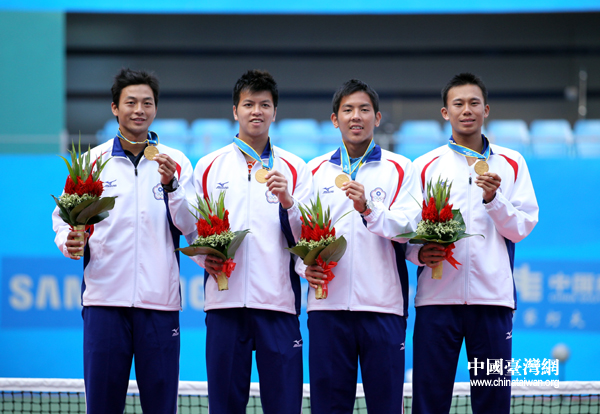 中華臺北隊男網團體獲得金牌,圖為選手們展示金牌。(中國臺灣網 鐘寶華 攝)