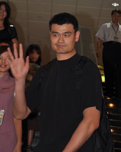 來臺參加“2010姚基金慈善之旅”活動的美國職籃休斯敦火箭隊中鋒姚明(前),26日下午搭機抵達桃園機場,揮手時還故意扮怪臉。 來源:“中央社”