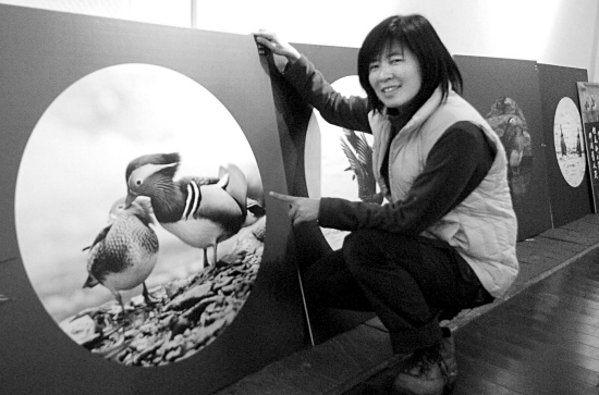 1月5日,臺灣攝影師張燕伶在展示她拍攝的鴛鴦照片。來源:淅江新聞網