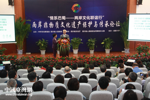 兩岸非物質文化遺產保護與傳承論壇是“情系巴蜀 兩岸文化聯誼行”的重要活動之一,由前;鶗倍麻L焦仁和率領的95名臺灣文化、教育界人士出席論壇,與四川學者共議非遺保護與傳承。(記者 張瑞宸 趙輝)