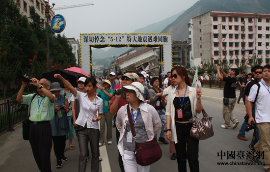 臺灣嘉賓來到北川地震遺址,神情凝重地聽講解員講述三年前的那場浩劫給美麗的羌城帶來的災難。(中國臺灣網 趙輝 攝)